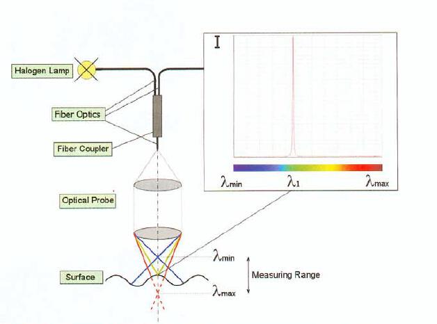 该系统主要由光谱仪、光源和光学探头组成;光源通过多模光纤进入光学探头,光学探头将不同波长的光聚焦到透镜上不同距离处形成色散,同时在透镜上下表面不同波长的光形成自垂直产生反射光谱信号进入光学探头传输进入光谱仪获得不同波长的离焦量;然后通过软件算法计算得到透镜的中心厚度。