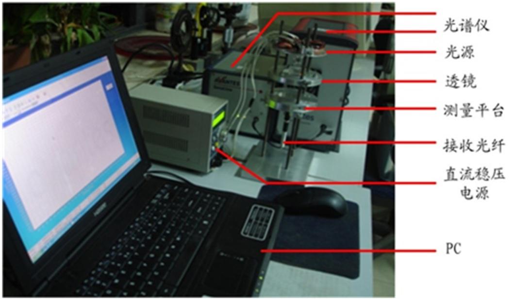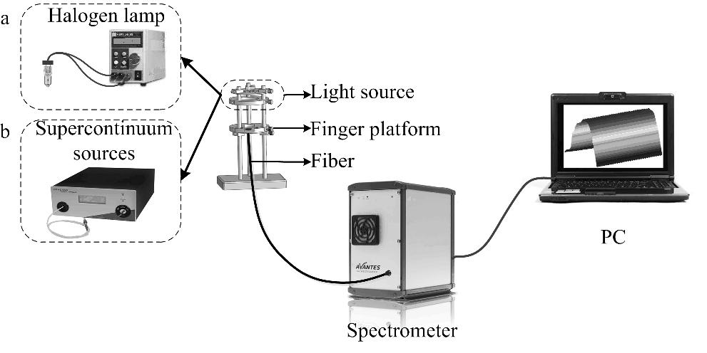 在300~1500nm可见-近红外波段中,还原血红蛋白(Hb)、氧合血红蛋白(HbO2)和水(H2O)的吸收系数曲线如图1所示,利用Hb和HbO2吸收系数的差别,由朗伯比尔定律进行血氧饱和度的测量。通常选取指端、耳垂等部位进行血氧测量。血氧光谱测量采取在体指端透射测量。采集装置由光源、光纤、光谱仪、电脑四个部分构成,如图2 所示。光源采用卤素灯,光纤为定制光纤束,其出射端成“一”字排列与光谱仪入射狭缝匹配;光谱仪采用荷兰Avantes公司AvaSpec-HS1024x58TEC-USB2和AvaSpec-NIR256-1.7TEC,内置制冷型背照式CCD探测器阵列和制冷型InGaAs探测器阵列,其波长范围分别为200~1160nm和1050-1700nm;光谱仪与计算机之间通过USB线连接。