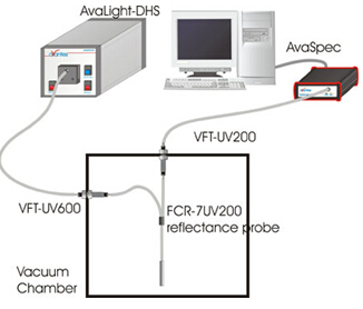 对于大多数此类监测系统来说都需要专门的实验布局,我们可以为您提供适合您应用的实验布局,这里仅举一个应用系统的例子。在这里使用一个反射型光纤探头来在线监测镀膜生产过程。光纤通过过真空装置进入真空室,然后传到反射探头上。反射光经过另一个过真空装置,进入光谱仪的一个测量通道。反射型探头可以用SMA接头拆下。还可以再增加一个光谱仪通道,用来进行参考测量或补偿光源本身的波动对测量结果的影响。