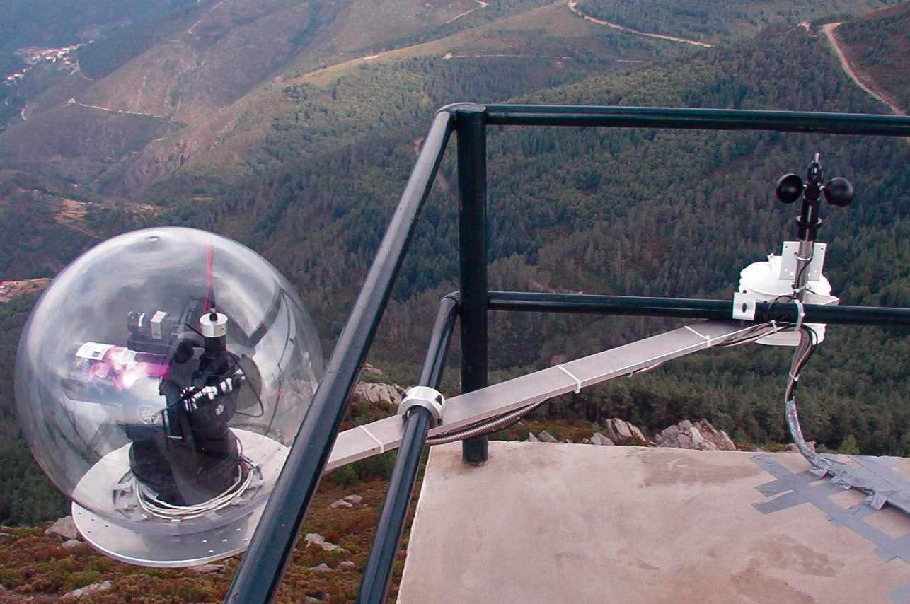 森林火灾探测器是葡萄牙研制的一款火灾探测及跟踪系统。这一系统通常由单独或一系列高塔组成,每个塔顶上放置一套光谱仪和望远镜来监视森林覆盖区域内的光谱。每套设备由一个AvaSpec-ULS2048-USB2型光谱仪,一个摄像机,气象站,望远镜,处理/控制单元和通信单元组成。望远镜和摄像机不间断的进行环视扫描,转动范围达320°。光谱仪通过光纤连接至望远镜,可以采集15公里远的光谱信息,这些光谱信息随即被处理和分析。摄像机根据预设的时间间隔进行拍照,图像也实时传输。摄像机和望远镜是联动的,用于确认测量目标。一旦该系统探测到森林火灾,会自动通过SMS、IP、GSM等技术发出警报。警报包含了很多信息,如火灾位置,探测时间,天气条件和火灾图像。其中天气条件包括风向,风速,温度和湿度信息。