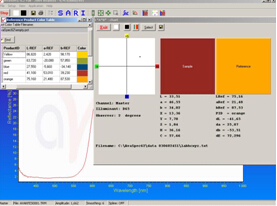 以CIELAB图表显示,还有实际的样品颜色和参色以及相应的△ELab, △L*, △a*, 或 △b*值都可以被显示和保存。